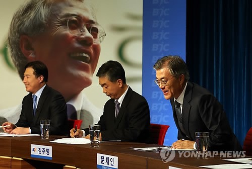(서울=연합뉴스) 전수영 기자 = 민주통합당 문재인 대선후보가 20일 오전 서울 63시티에서 열린 한국방송기자클럽 주최 대선후보 초청 토론회에서 참석자들을 향해 인사하고 있다.